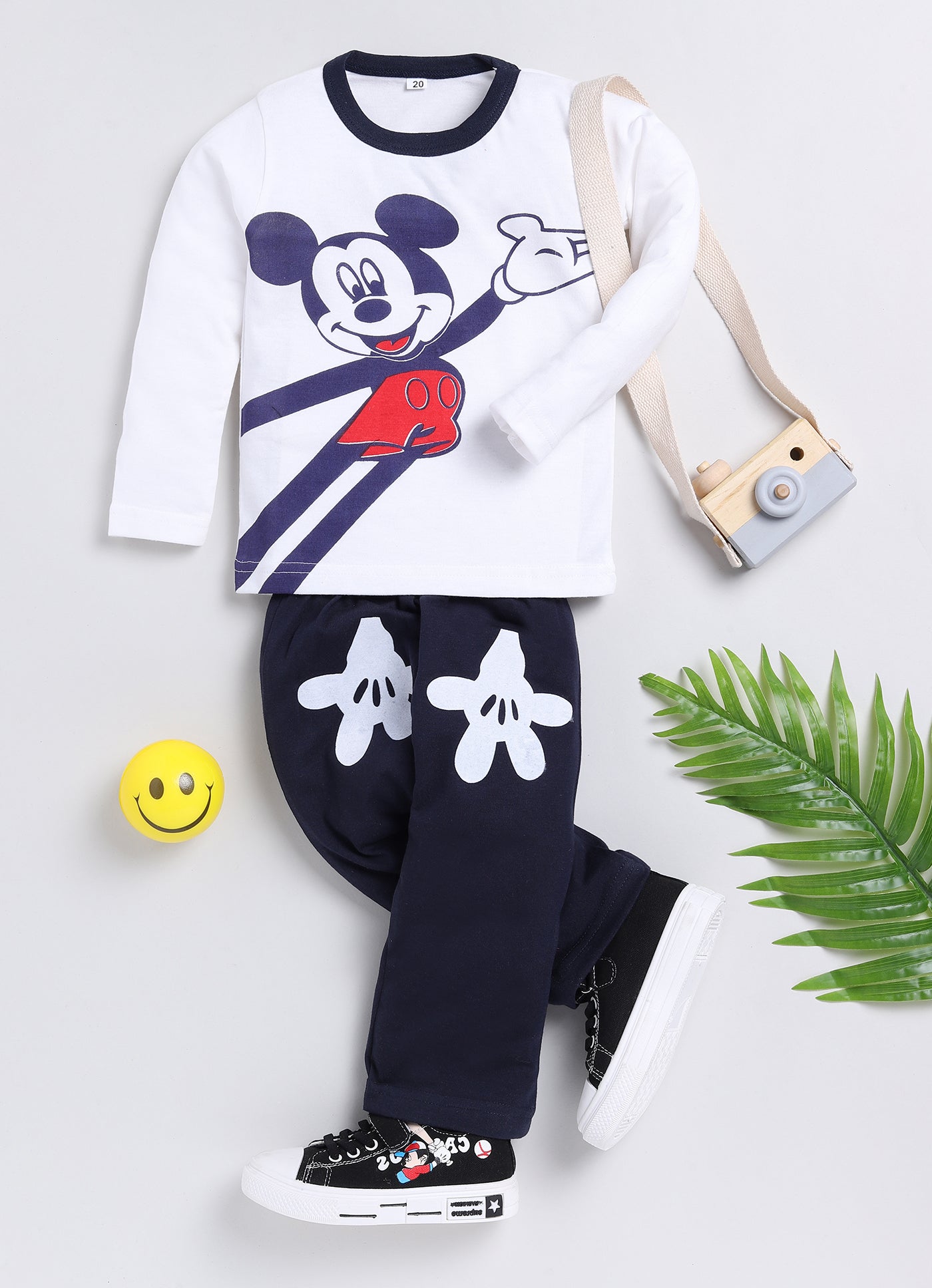 Mickey Print Cotton Sinker Nightwear Full Sleeves Clothing Set (White & Navy)